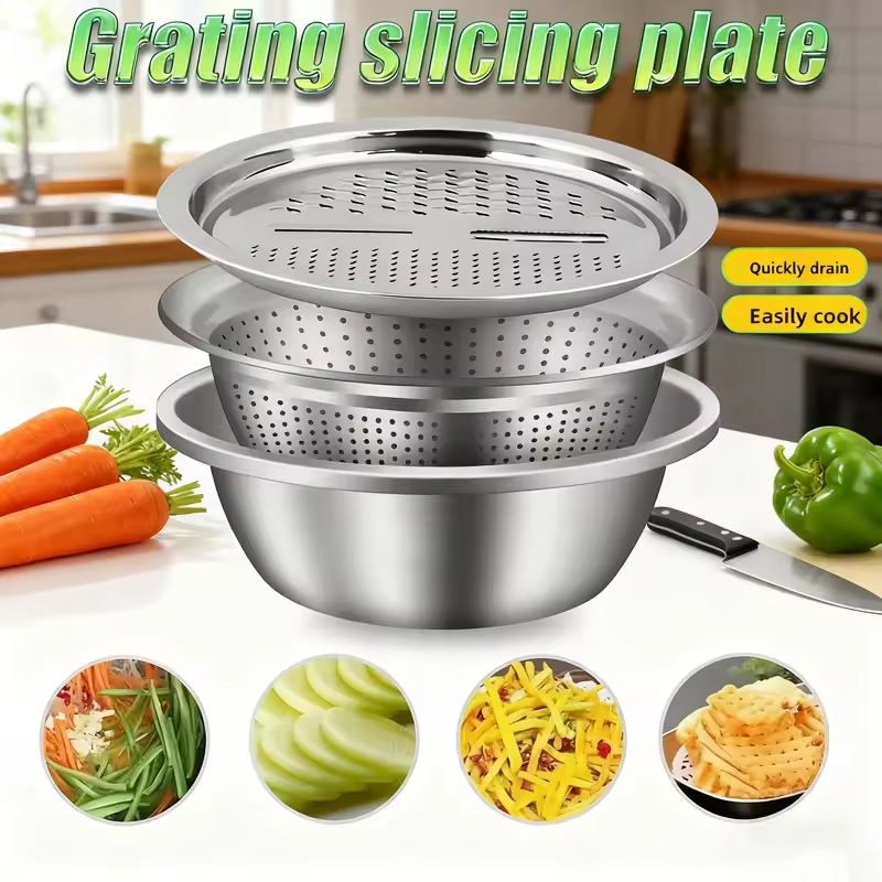 ✔️ ৩-ইন-১ মাল্টিফাংশনাল ডিজাইন — সবজি কাটার, ড্রেইন বাস্কেট ও বোল একসাথে।